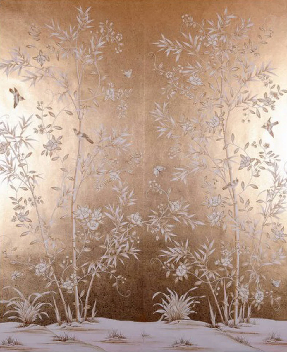 ORIGINAL Hand-painted Gold Foil wallpaper Peony flowers birds hand painted wallcovering many pictures option